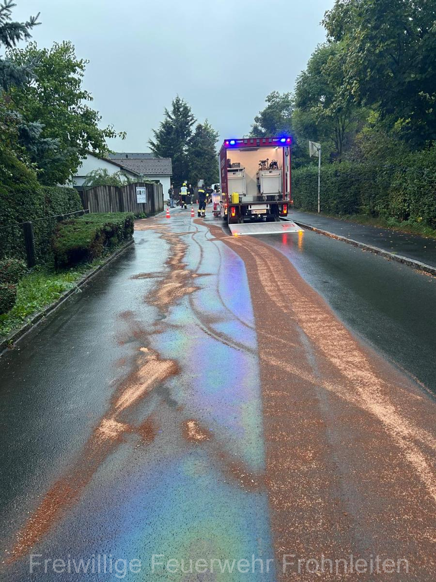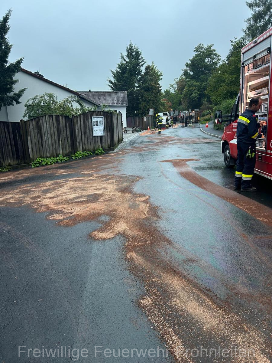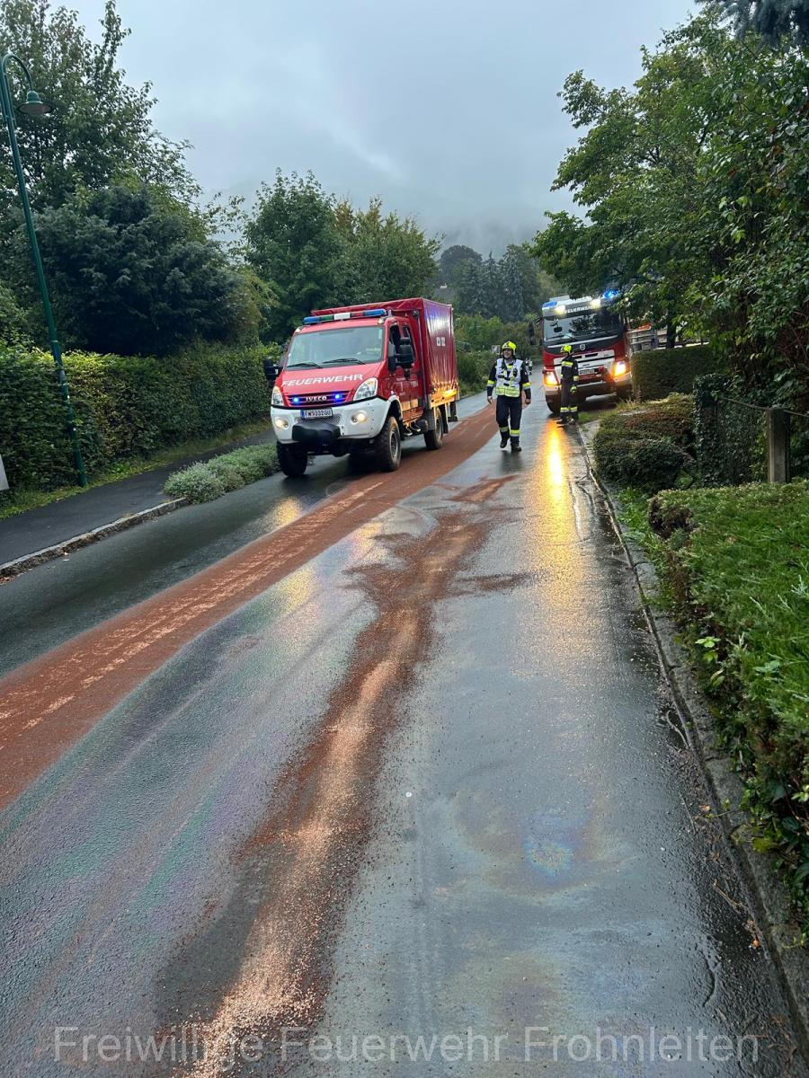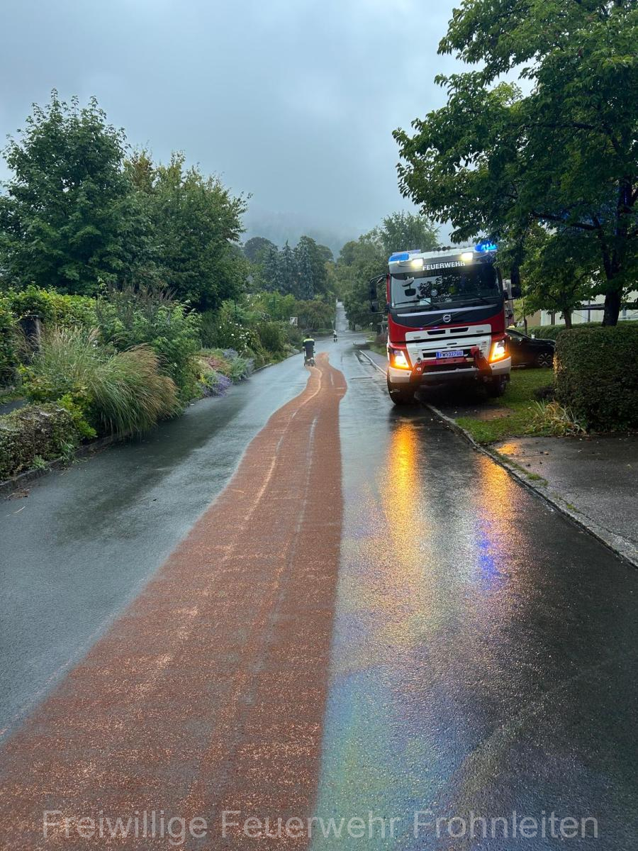 Ein geplatzter Hydraulikschlauch einer Arbeitsmaschine führte zu einem Ölaustritt auf der Dr. Ammann-Straße in Frohnleiten. Die Kräfte der Freiwilligen Feuerwehr Frohnleiten konnten die aufgrund des Regenwassers bereits großflächig verteilte Öllacke mittels Ölbindemittel großteils beseitigen. Dabei wurden diese von einer Kehrmaschine der Stadtgemeinde Frohnleiten unterstützt.