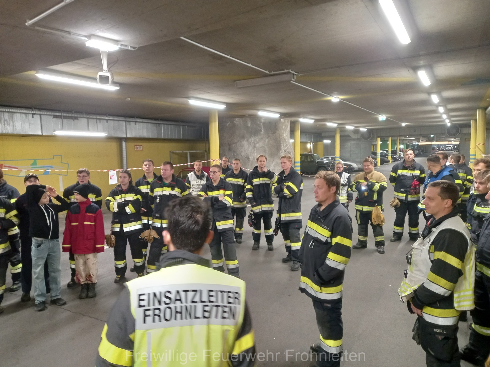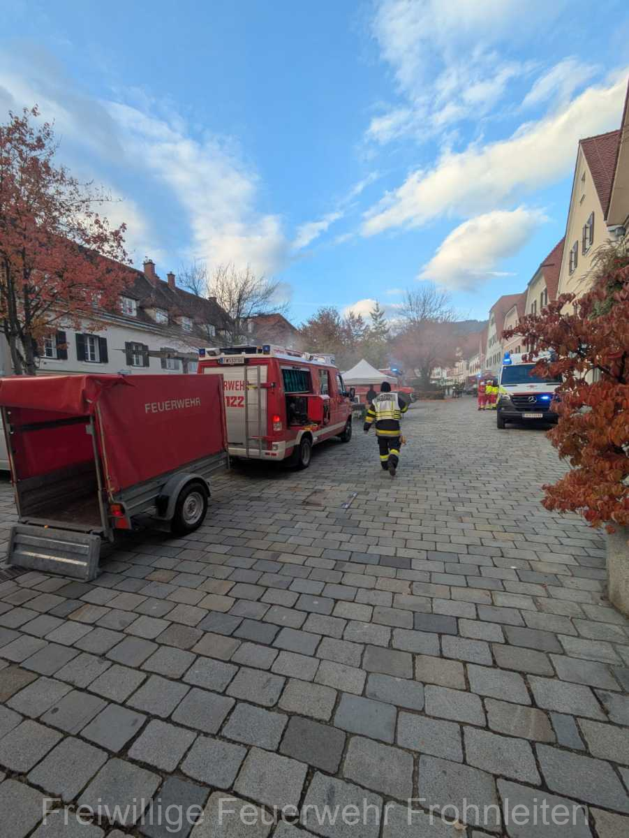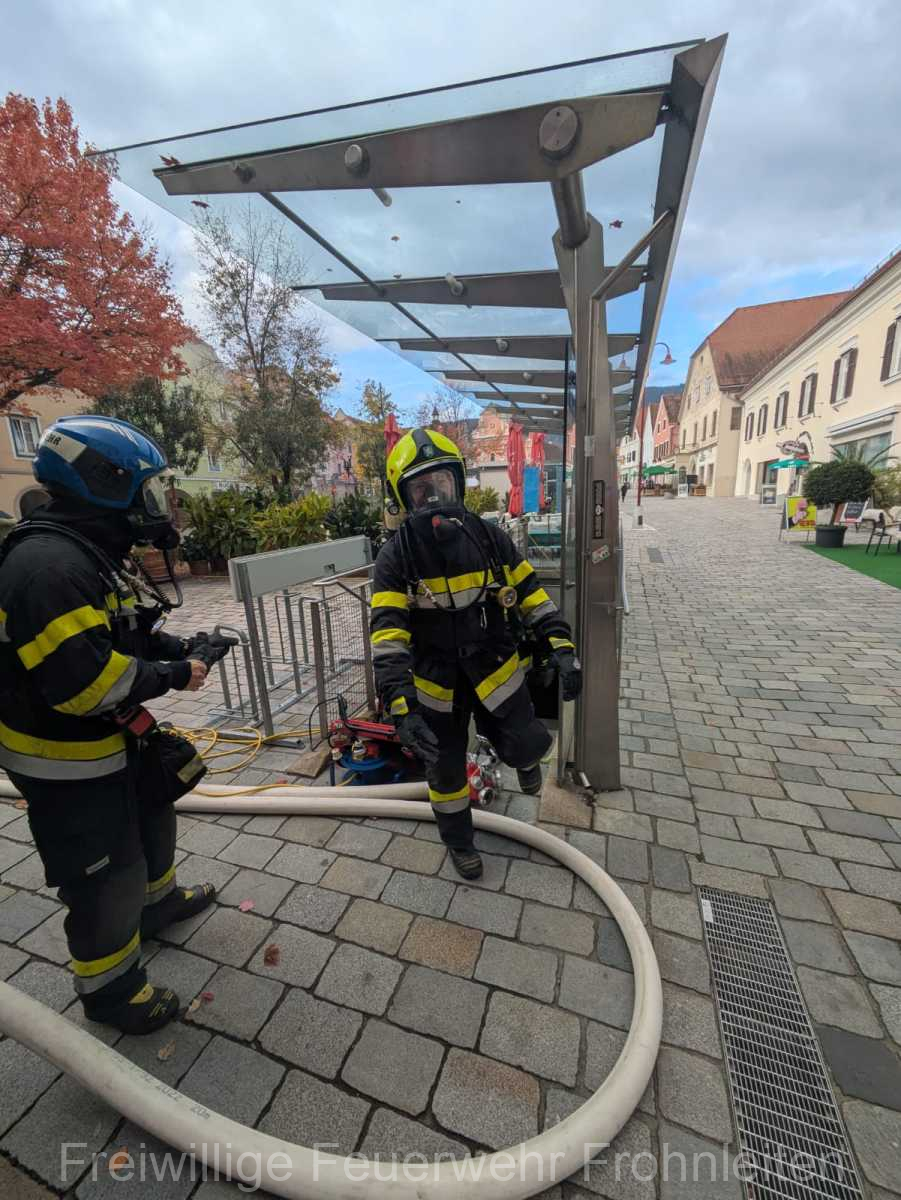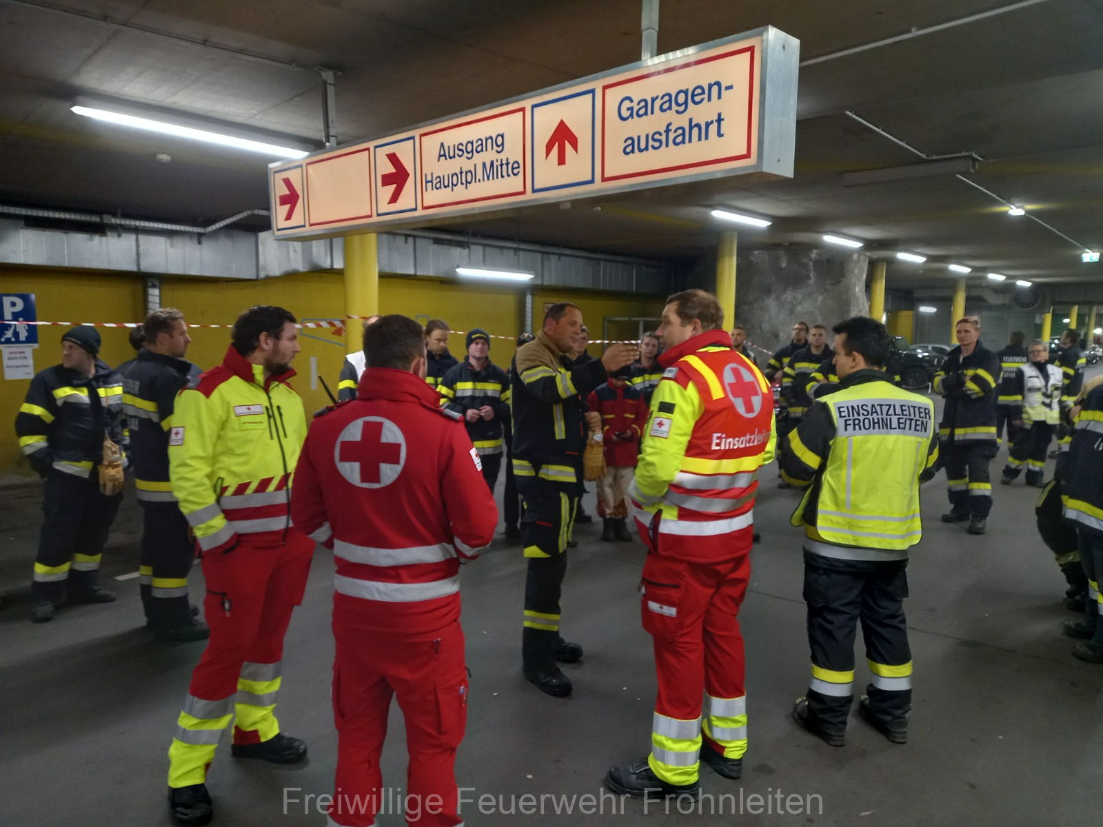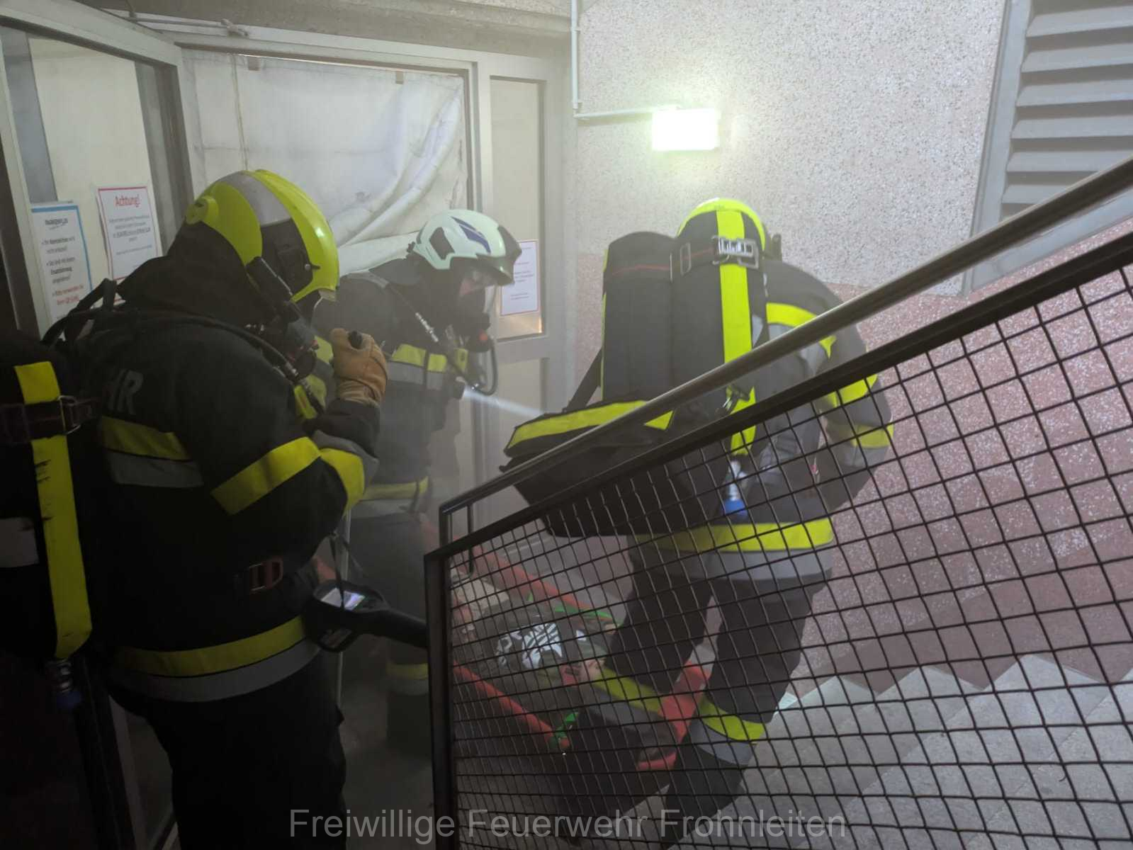 Die Freiwillige Feuerwehr Frohnleiten-Stadt führte am vergangen Samstag ihre alljährliche Abschlussübung durch. Der erste Einsatzbefehl lautete “Brandmeldeanlagenalarm Tiefgarage Hauptplatz”, ein alltäglicher Alarm für die Mitglieder der Feuerwehr. Nach der Erkundung durch den Einsatzleiter OLM Valentin Weingerl stellte sich schnell heraus, dass es sich um einen PKW Brand in der Tiefgarage handelt. Ein Szenario, vor dem die Mitglieder großen Respekt haben, da ja bekanntlich Brandrauch und Hitze nicht abziehen können. So wurde im Rahmen der Übung, die Feuerwehren Röthelstein, Mayr-Melnhof, Peggau und Deutschfeistritz nachalarmiert. Für die Führungsunterstützung wurde das Einsatzleitfahrzeug des BFV Graz-Umgebung betrieben von der Feuerwehr Seiersberg nachalarmiert. Für die taktische Ventilation wurde erstmalig das LUF Nano der Feuerwehr Werndorf hinzugezogen. Mit diesen neu angeschafften Gerät ist es möglich, große Rauchmengen zu bewegen. Der LKW mit Atemluftkompressor Steinberg-Rohrbach unterstütze die Feuerwehren durch das Aufüllen der Atemluftflaschen. Beübt wurden die Maßnahmen Löschen, Suchen und Retten und die Sicherung der Schlüsselstellen. Die Übungsziele wurden auf die Tiefgaragentaktik des BFV Graz-Umgebung ausgelegt und wurden von allen Übungsteilnehmern erfüllt. Das Rote Kreuz Frohnleiten beteiligte sich auch bei der Übung. So wurden vom ÖRK die Verletztendarsteller geschminkt und während der Übung wurde eine gemeinsame Einsatzleitung betrieben und eine Sanitätshilfsstelle aufgebaut.