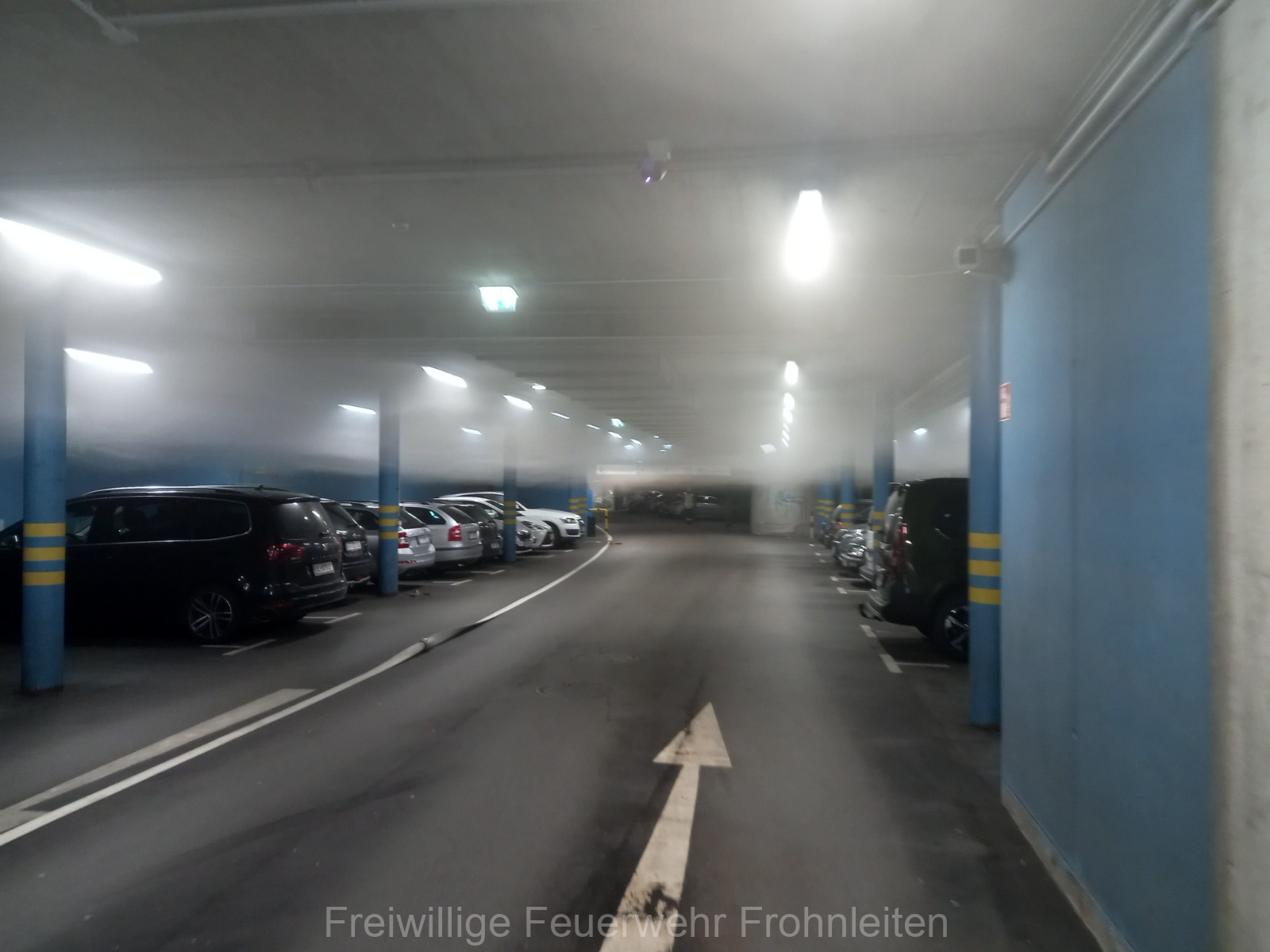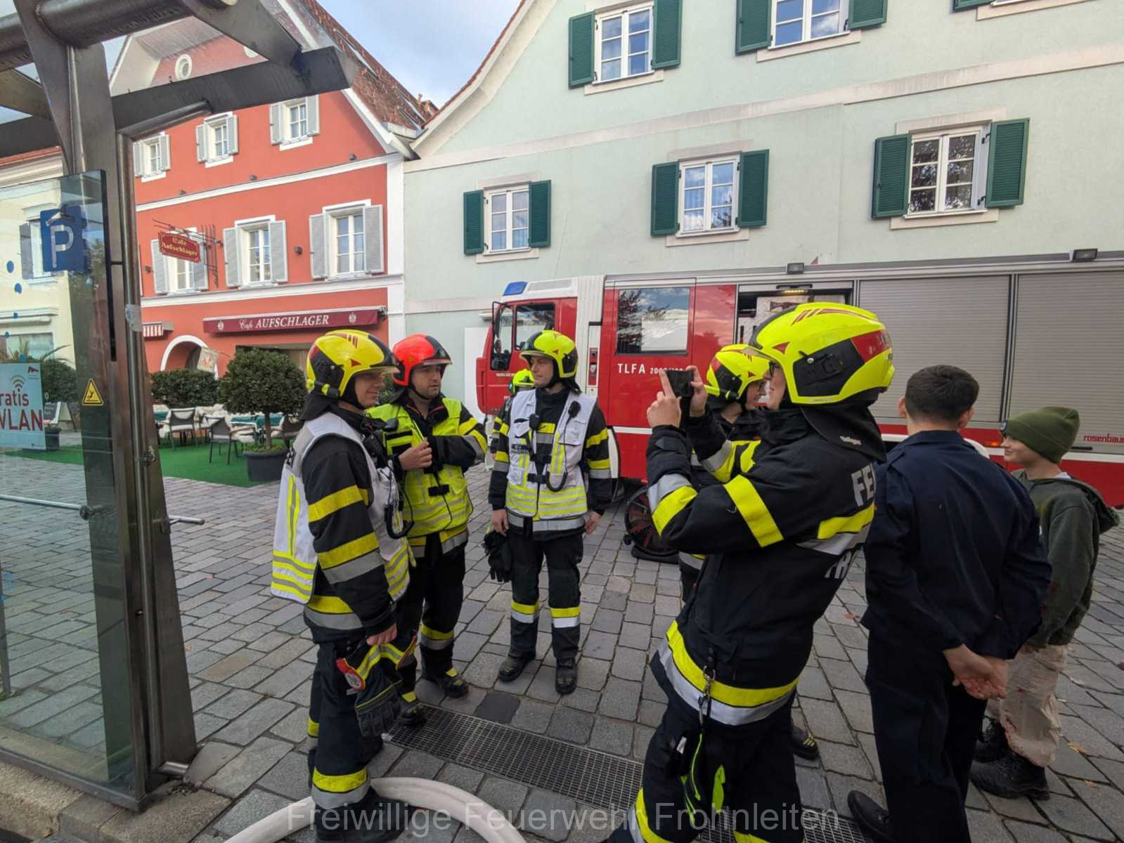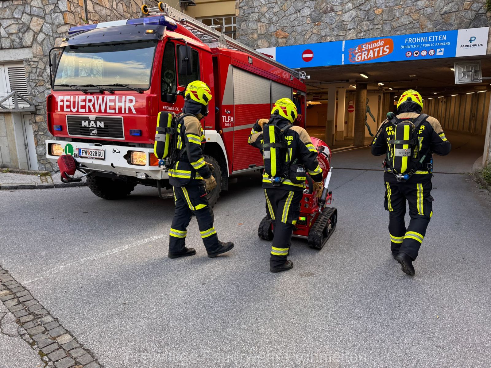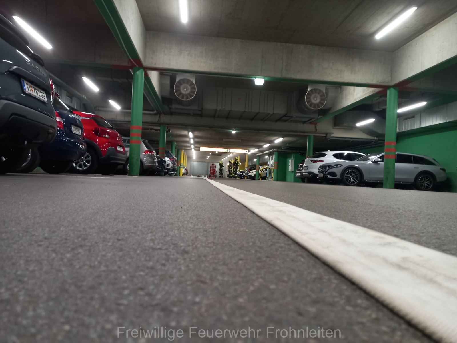Die Freiwillige Feuerwehr Frohnleiten-Stadt führte am vergangen Samstag ihre alljährliche Abschlussübung durch. Der erste Einsatzbefehl lautete “Brandmeldeanlagenalarm Tiefgarage Hauptplatz”, ein alltäglicher Alarm für die Mitglieder der Feuerwehr. Nach der Erkundung durch den Einsatzleiter OLM Valentin Weingerl stellte sich schnell heraus, dass es sich um einen PKW Brand in der Tiefgarage handelt. Ein Szenario, vor dem die Mitglieder großen Respekt haben, da ja bekanntlich Brandrauch und Hitze nicht abziehen können. So wurde im Rahmen der Übung, die Feuerwehren Röthelstein, Mayr-Melnhof, Peggau und Deutschfeistritz nachalarmiert. Für die Führungsunterstützung wurde das Einsatzleitfahrzeug des BFV Graz-Umgebung betrieben von der Feuerwehr Seiersberg nachalarmiert. Für die taktische Ventilation wurde erstmalig das LUF Nano der Feuerwehr Werndorf hinzugezogen. Mit diesen neu angeschafften Gerät ist es möglich, große Rauchmengen zu bewegen. Der LKW mit Atemluftkompressor Steinberg-Rohrbach unterstütze die Feuerwehren durch das Aufüllen der Atemluftflaschen. Beübt wurden die Maßnahmen Löschen, Suchen und Retten und die Sicherung der Schlüsselstellen. Die Übungsziele wurden auf die Tiefgaragentaktik des BFV Graz-Umgebung ausgelegt und wurden von allen Übungsteilnehmern erfüllt. Das Rote Kreuz Frohnleiten beteiligte sich auch bei der Übung. So wurden vom ÖRK die Verletztendarsteller geschminkt und während der Übung wurde eine gemeinsame Einsatzleitung betrieben und eine Sanitätshilfsstelle aufgebaut.