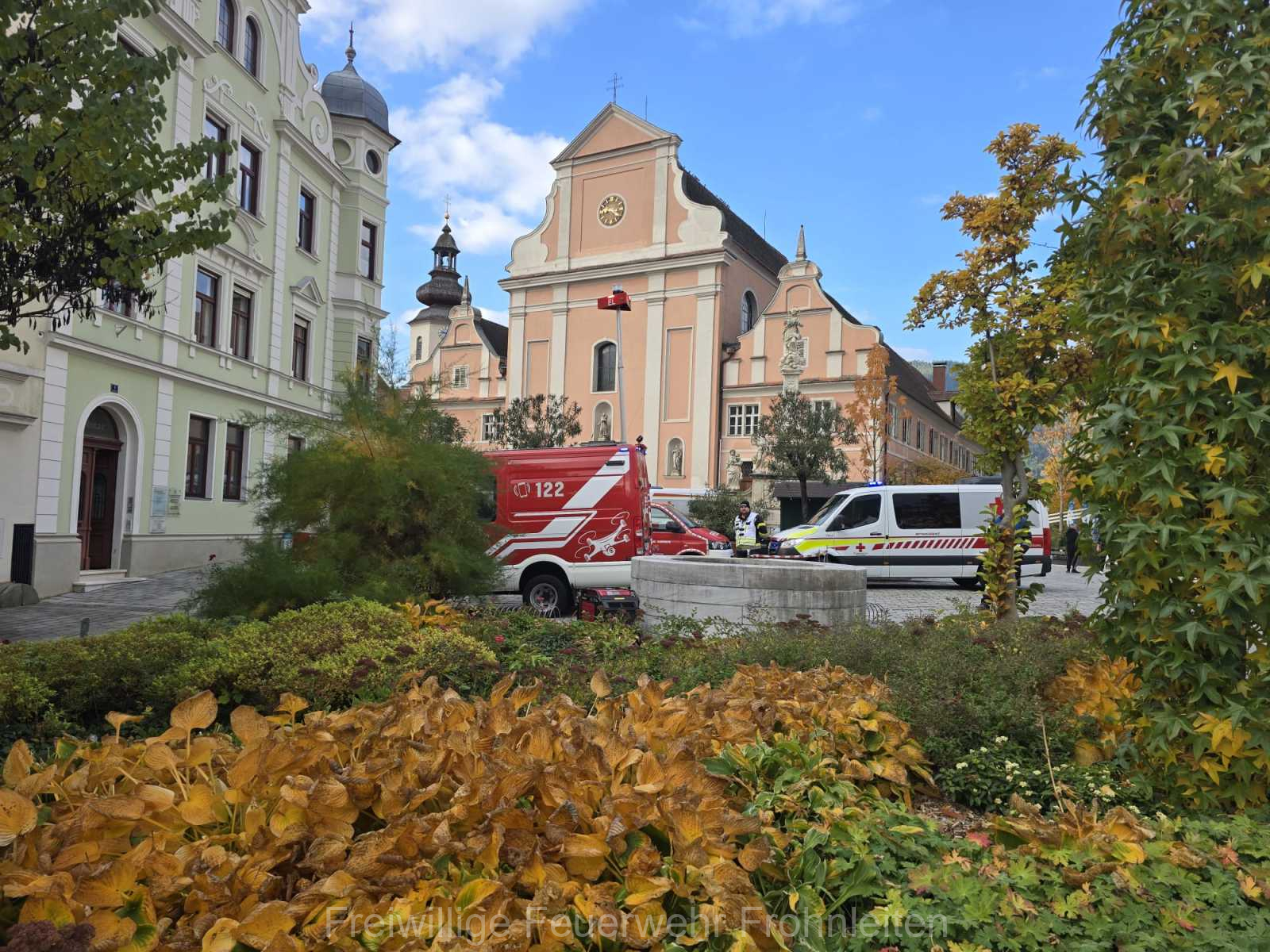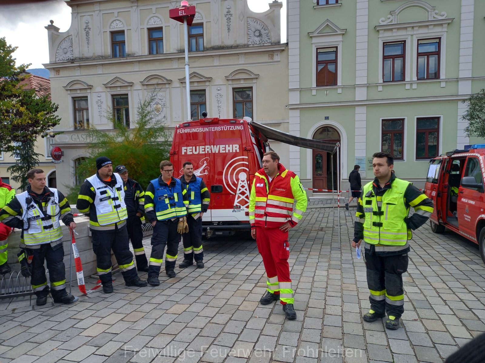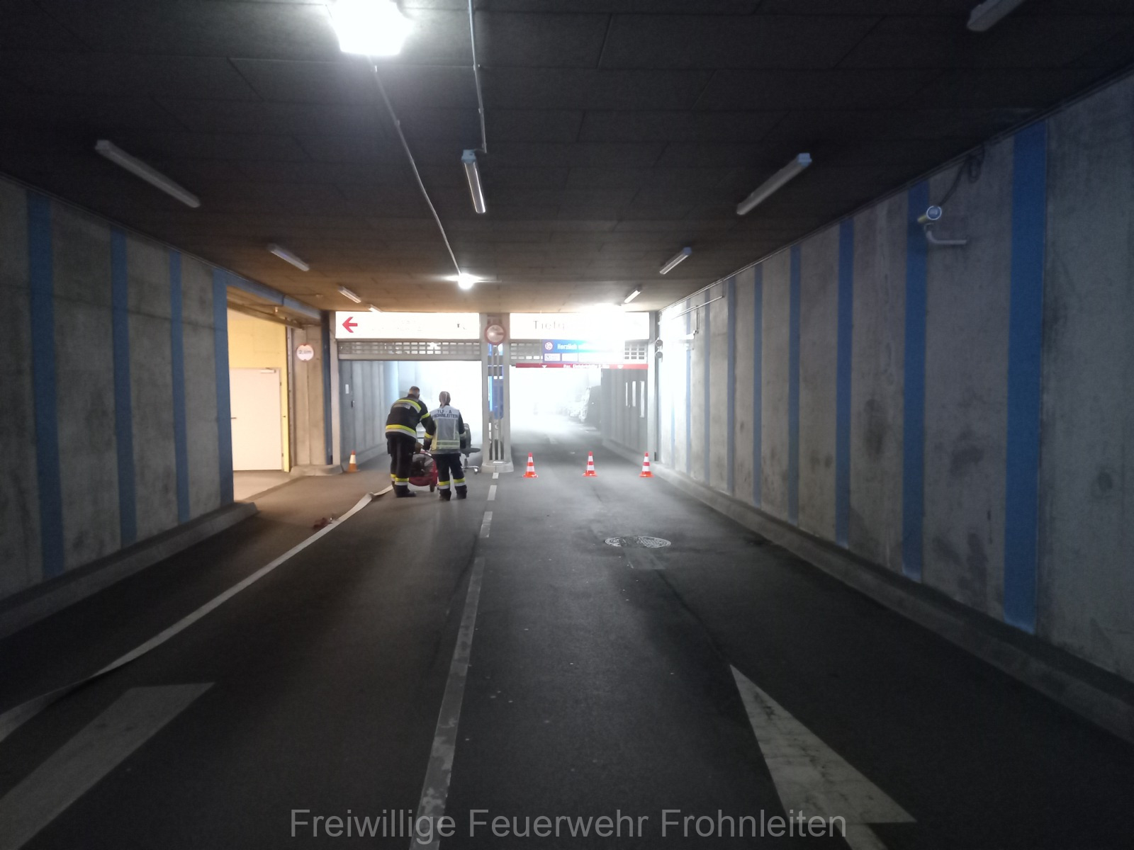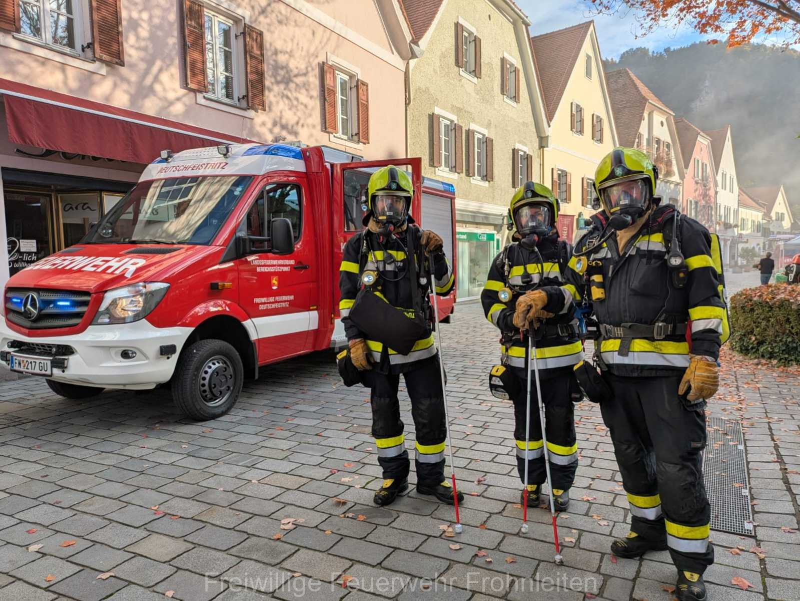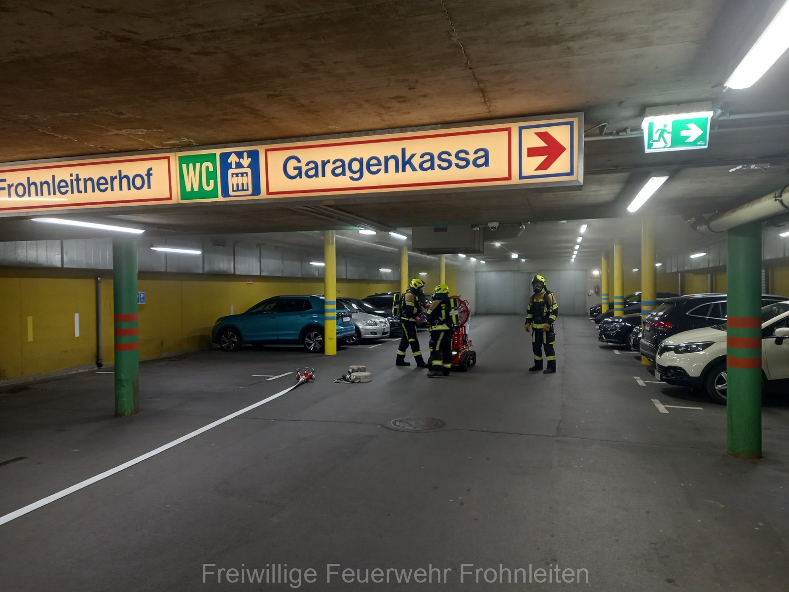 Die Freiwillige Feuerwehr Frohnleiten-Stadt führte am vergangen Samstag ihre alljährliche Abschlussübung durch. Der erste Einsatzbefehl lautete “Brandmeldeanlagenalarm Tiefgarage Hauptplatz”, ein alltäglicher Alarm für die Mitglieder der Feuerwehr. Nach der Erkundung durch den Einsatzleiter OLM Valentin Weingerl stellte sich schnell heraus, dass es sich um einen PKW Brand in der Tiefgarage handelt. Ein Szenario, vor dem die Mitglieder großen Respekt haben, da ja bekanntlich Brandrauch und Hitze nicht abziehen können. So wurde im Rahmen der Übung, die Feuerwehren Röthelstein, Mayr-Melnhof, Peggau und Deutschfeistritz nachalarmiert. Für die Führungsunterstützung wurde das Einsatzleitfahrzeug des BFV Graz-Umgebung betrieben von der Feuerwehr Seiersberg nachalarmiert. Für die taktische Ventilation wurde erstmalig das LUF Nano der Feuerwehr Werndorf hinzugezogen. Mit diesen neu angeschafften Gerät ist es möglich, große Rauchmengen zu bewegen. Der LKW mit Atemluftkompressor Steinberg-Rohrbach unterstütze die Feuerwehren durch das Aufüllen der Atemluftflaschen. Beübt wurden die Maßnahmen Löschen, Suchen und Retten und die Sicherung der Schlüsselstellen. Die Übungsziele wurden auf die Tiefgaragentaktik des BFV Graz-Umgebung ausgelegt und wurden von allen Übungsteilnehmern erfüllt. Das Rote Kreuz Frohnleiten beteiligte sich auch bei der Übung. So wurden vom ÖRK die Verletztendarsteller geschminkt und während der Übung wurde eine gemeinsame Einsatzleitung betrieben und eine Sanitätshilfsstelle aufgebaut.
