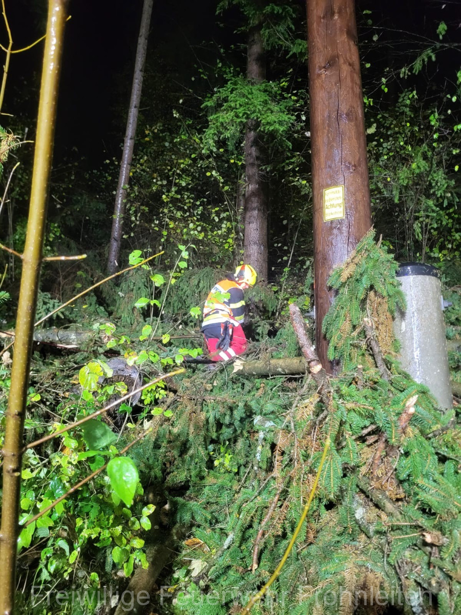 Aufgrund des kurzzeitig starken Sturms fiel ein Baum im Bereich der Fressnerkurve auf der B64 Rechberg-Bundesstraße auf eine Stromleitung. Dieser musste unter höchster Vorsicht aufgrund der abhängenden Leitung unter Aufsicht der Energie Steiermark mittels Motorsägen entfernt werden.