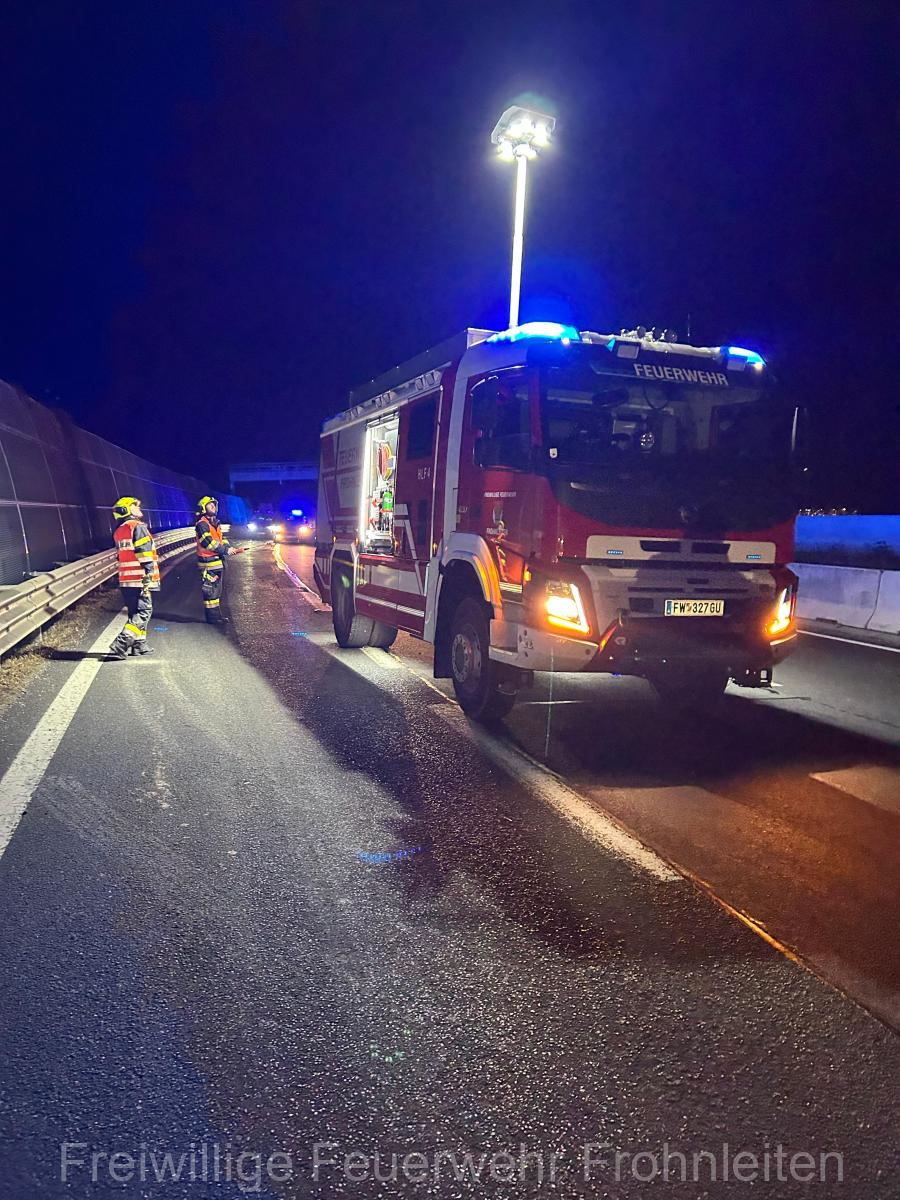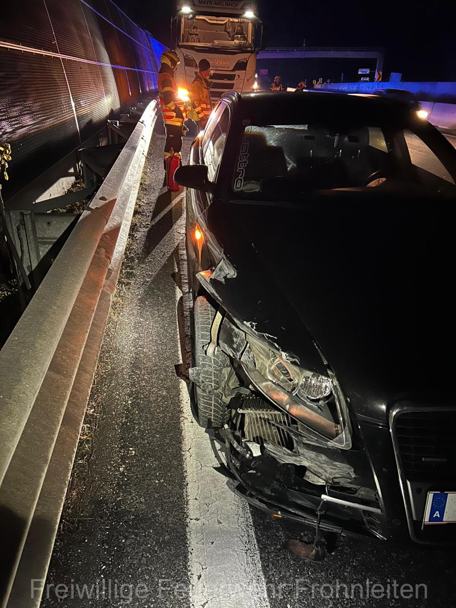 Aus bisher ungeklärter Ursache touchierte ein PKW die Leitschiene bei der Auffahrt Frohnleiten Süd. Der Lenker wurde mit Verletzungen unbestimmten Grades durch einen Rettungswagen des Roten Kreuzes in ein naheliegendes Krankenhaus verbracht. Nach den Tätigkeiten an der Unfallstelle wurde diese nach ca. 45 Minuten wieder freigegeben und die ausgerückten Kräfte der Freiwilligen Feuerwehr Frohnleiten konnten wieder in das Rüsthaus einrücken. Die laut Alarmplan mitalarmierte FF Peggau konnte noch bei Anfahrt storniert werden.