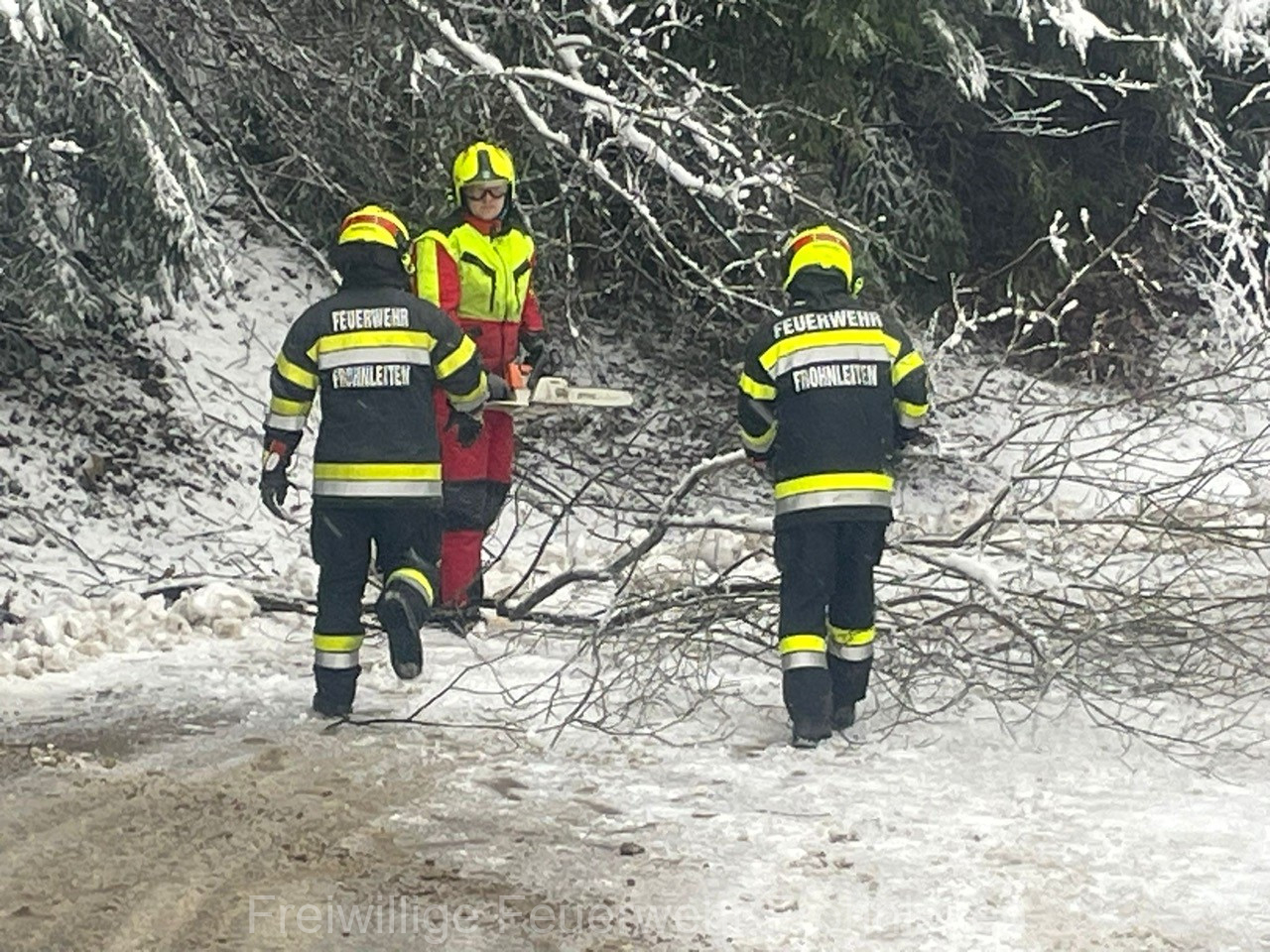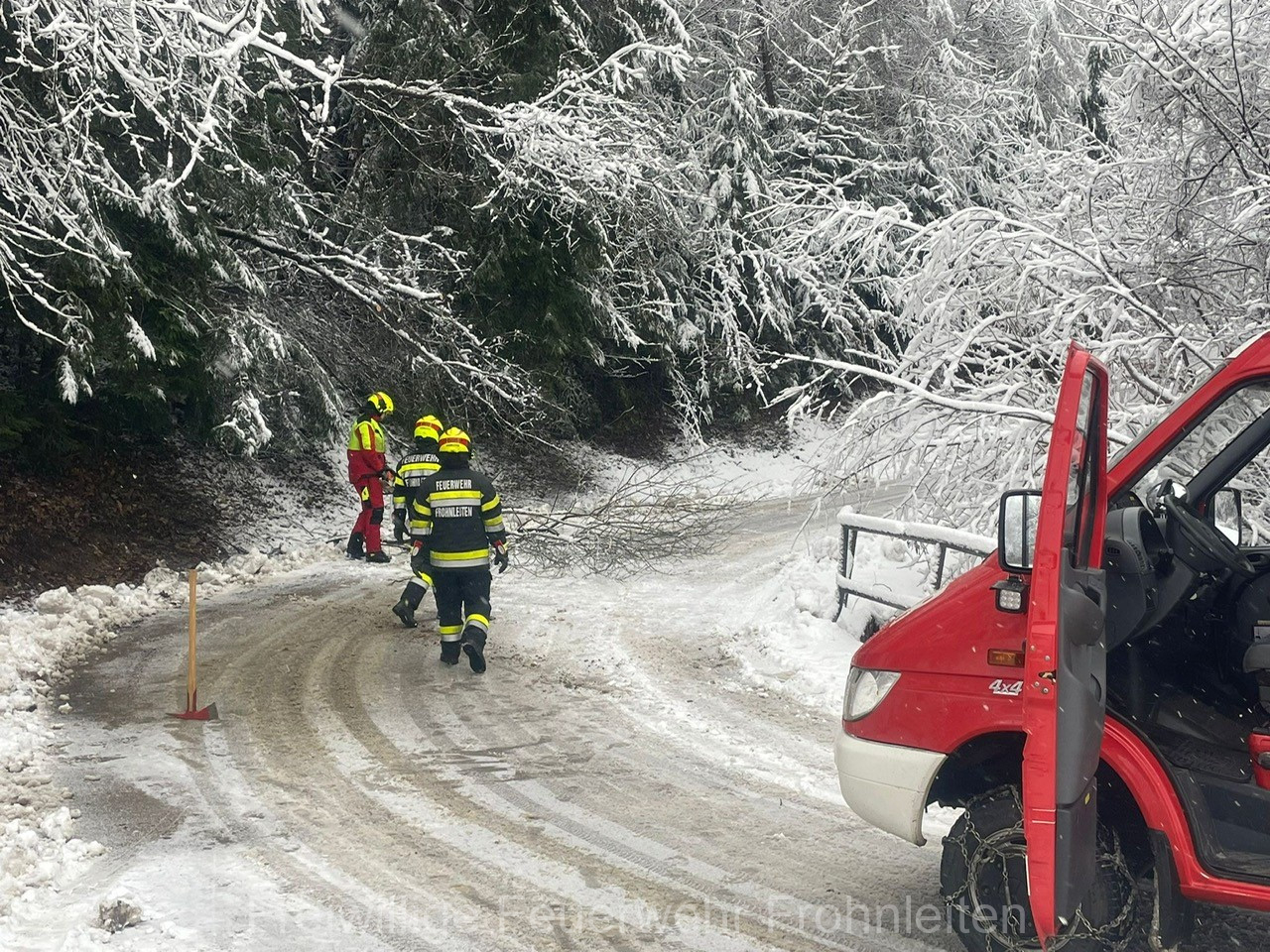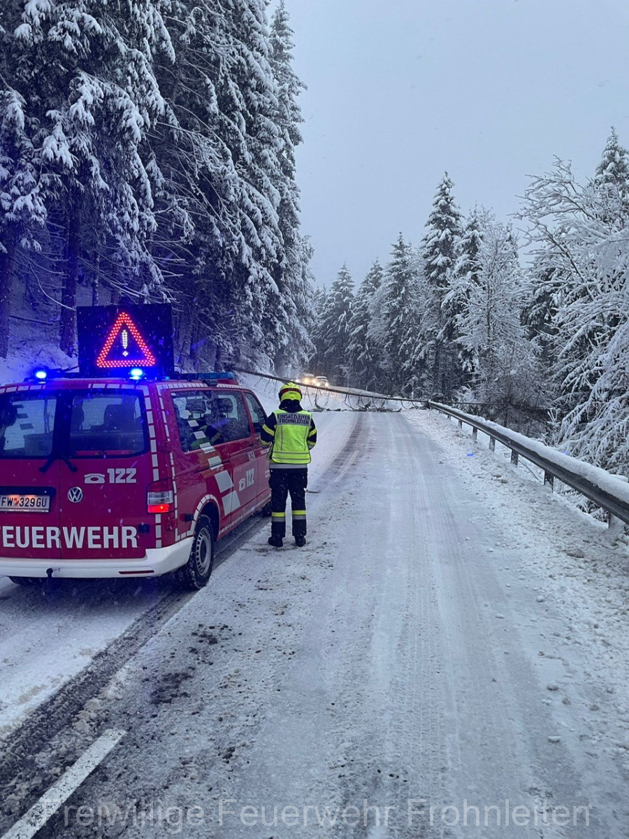 Die Schneemassen trafen in der Nacht von Donnerstag auf Freitag auch Frohnleiten, weshalb die Kräfte der Freiwilligen Feuerwehr bei mehreren Einsatzadressen gefordert waren. Insgesamt wurden zwischen 20 und 30 Bäume bei vier Einsatzadressen entfernt, um die Hauptverkehrsverbindungen und Zufahrten freizuhalten. Aufgrund der weiteren Gefahr von umfallenden Bäumen mussten jedoch trotzdem mehrere Straßen, darunter auch die B64 – Rechberg Bundesstraße, der Stadtgemeinde Frohnleiten für mehrere Stunden bzw. Tage gesperrt werden. Die Polizei Frohnleiten unterstützte bei den Erstmaßnahmen der Straßensperren. Glücklicherweise kamen bei diesem Unwetterereignis keine Personen zu Schaden. Nach einer Einsatzzeit von rund sechs Stunden konnten alle eingesetzten Kräfte der FF Frohnleiten wieder einrücken und die Einsatzbereitschaft wiederherstellen.